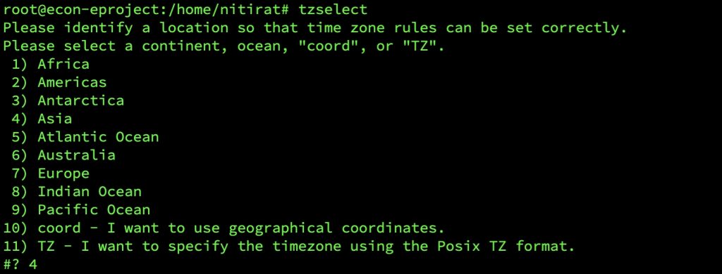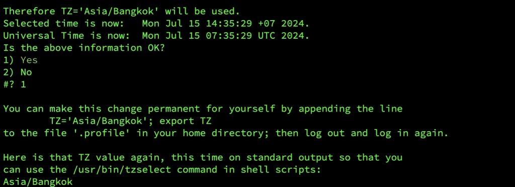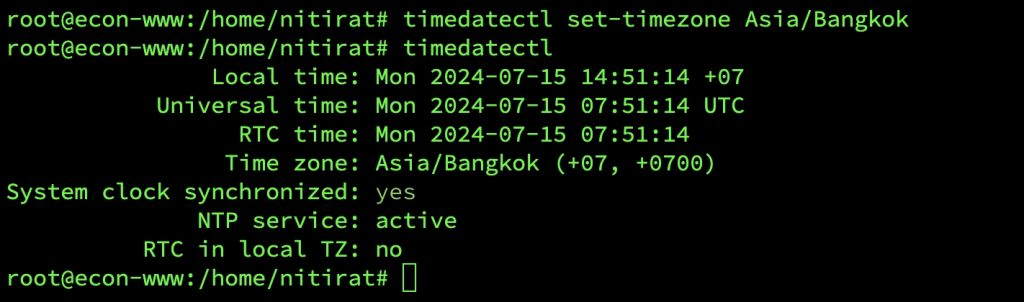How to Change the Timezone on Ubuntu nitiratJul 15, 2024Jul 15, 2024 user command # tzselect test Choose 51 for Thailand Choose 1 for Timezone Asia/Bangkok #timedatectl set-timezone Asia/Bangkok <span class="nav-subtitle screen-reader-text">Page</span> Previous PostHow to Add User to Sudoers or Sudo Group on UbuntuNext PostA stop job running for logstash (Nmin Ns / no limit) Related Posts Metabase Installation and Troubleshooting Guide (Ubuntu 20.04) 1. Installation (Standalone JAR) 1. Update System: sudo apt update... nitiratJul 10, 2025Jul 10, 2025 How to Install ClamAV on Ubuntu and Scan for Vulnerabilities ClamAV is free and open-source antivirus software that can be... nitiratApr 8, 2025Apr 8, 2025 How to Install Fail2ban to Stop Brute-Force Attacks on Ubuntu 24.04 Fail2ban is a powerful Python-based security tool that helps protect Linux... nitiratApr 8, 2025Apr 8, 2025